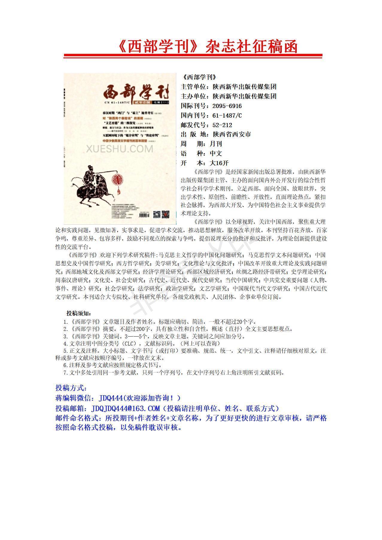 《西方学术期刊》经中华人民共和国新闻出版总署批准主办方:陕西新华出版传媒集团; ISSN:2095-6916CN:61-1487/C;国内外发行的哲学社会科学综合性学术期刊。